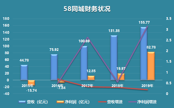 翻看58同城近年来的业绩,营收上,58同城最近5年来一直在增长,但公司的营收增速自2016年以来一直在下滑;净利润方面,58同城在2015年和2016年亏损,2017年扭亏为盈。值得注意的是,公司在2018年净利润增速大幅度下滑之后,2019年有了314%的增速,净利润达到82.78亿元。