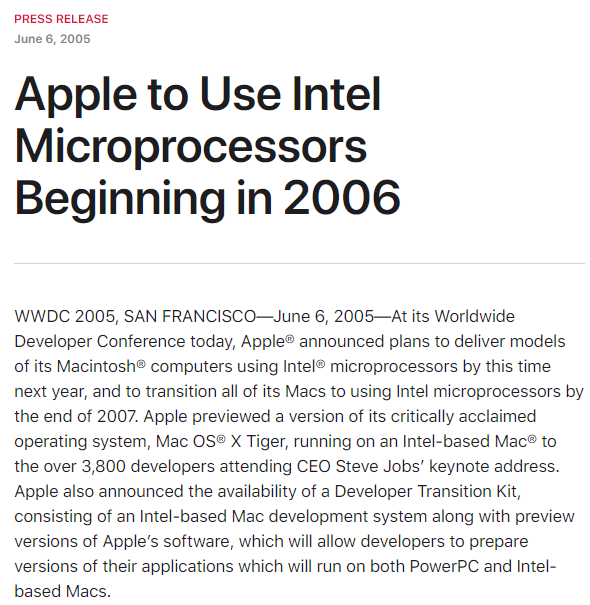 苹果在2005年6月6日宣布,从2006年开始将Mac的芯片转换为Intel芯片,并在2007年底之前将所有Mac转换为Intel芯片。
