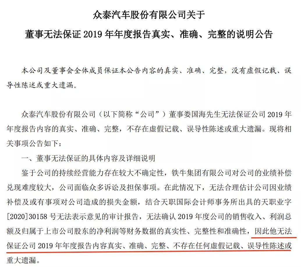 2019年众泰汽车巨亏112亿元,同比断崖式下跌1499%。即使亏成这样,会计师事务所依然出具了“无法表示意见”的审计报告,还有董事称财务数据“不保真”。