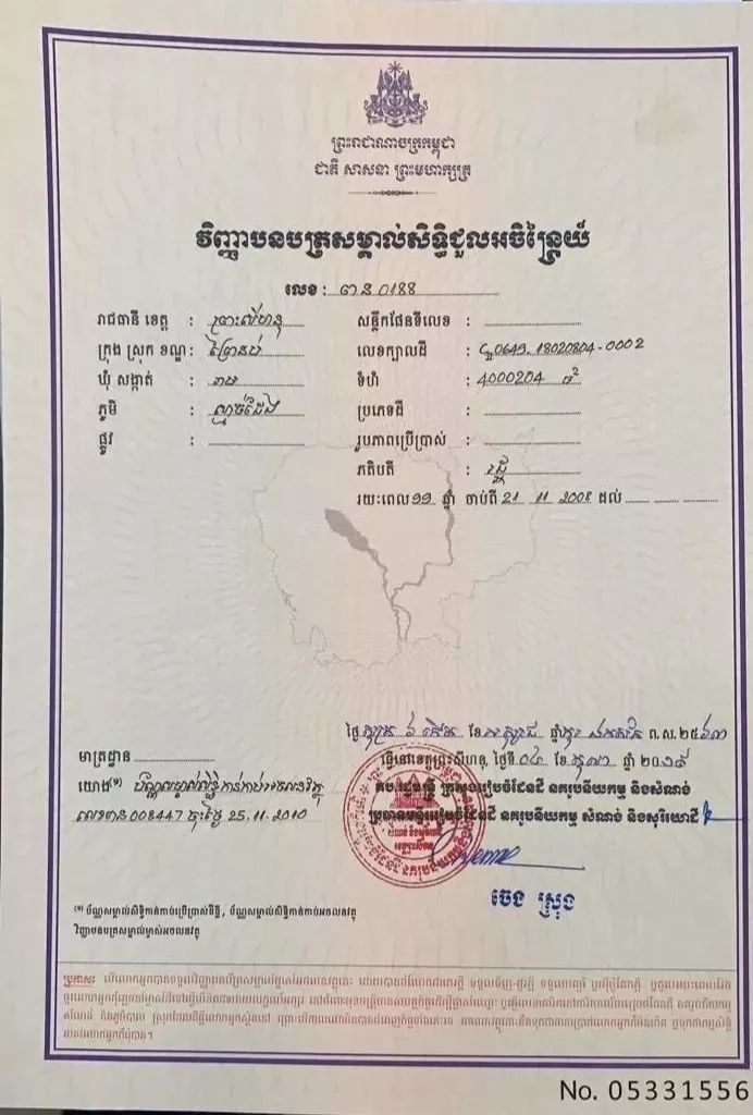 一位常住西港的柬语翻译告诉界面新闻记者,欧成效晒出的“土地证”里写明,这是一张土地租赁证,由柬埔寨国土规划部于2019年10月4日签发,土地位于西港,面积是400公顷,租期为99年,但时间却是从2008年11月21日算起,也就是说截至目前这块地的租期剩下不到88年。