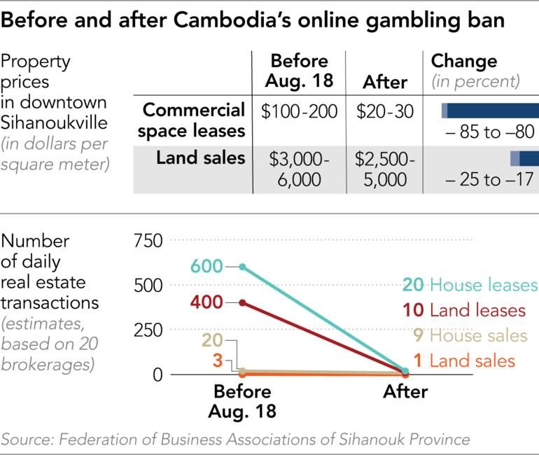 当地媒体估计,在禁令颁布之前,约有200家在线运营商,雇员人数超过20万。在禁令颁布后,有数万人离开西港,当地商会统计,餐馆日订单下降80%。世邦魏理仕柬埔寨(CBRE Cambodia)相关人士称,大型开发项目仍在继续,但中小型项目要么缩小了规模,要么停止施工,商业租金下降约30%,酒店租金下降约50%。