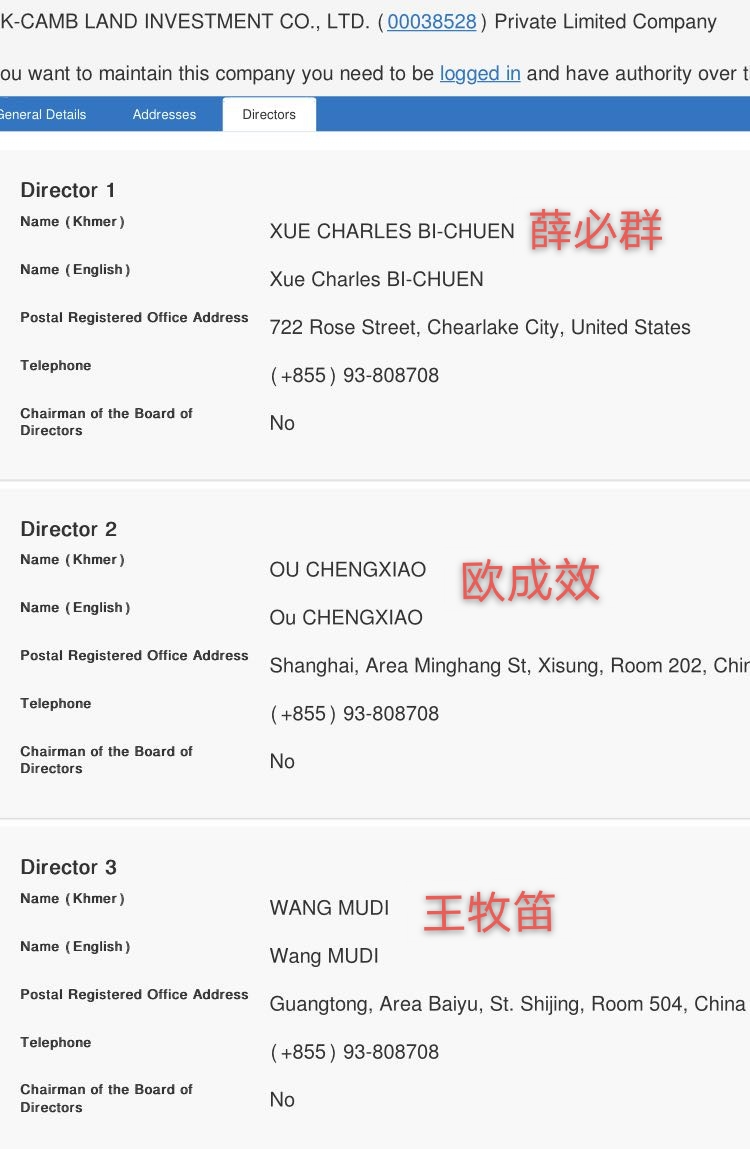 在柬埔寨商务部官方查册网站上,Wang Yingxian是京柬置地5个股东 之一,且担任董事会主席,然而他只注册了一个模糊不清的地址——“中国北京西城区39号房”。