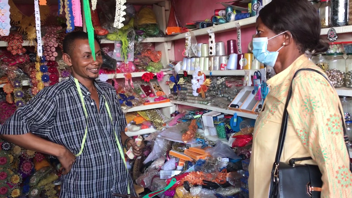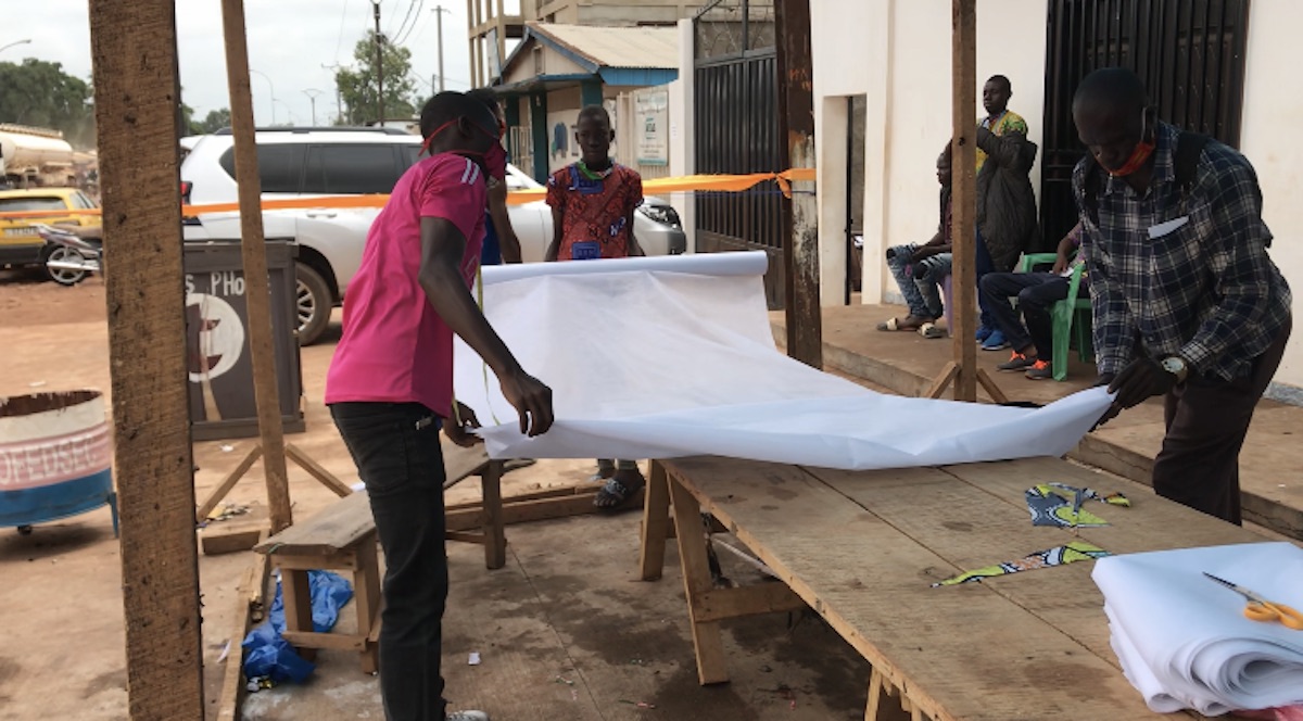 制定好计划的第一个周末,我和Jason还有他的两个合作伙伴一起去购置生产口罩的材料,主要包括缝纫线、口罩里外两层的布料、两层布料之间的加固材料vlieseline(无纺纤维),以及耳挂绳。我们在当地市场毫不费力地买到这四种材料。Jason告诉我,这些材料都是从喀麦隆或者刚果金进口的,但是原产地是中国和印度。