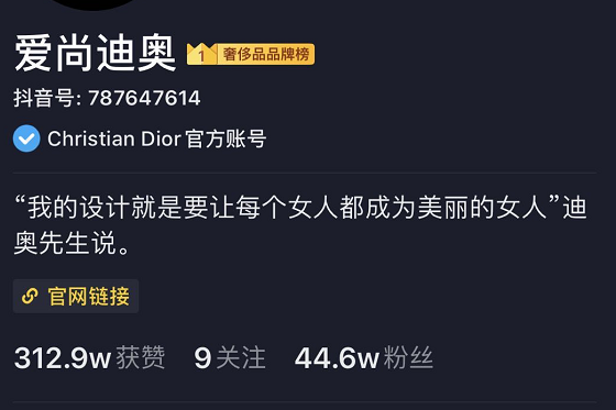 2018年,DIOR便率先注册了抖音账号,并对外宣称,入驻抖音不为卖货,而是为了品牌露出。目前该账号粉丝数为44.6W,内容也比B站上清一色广告大片更有点“阳间”气。不过,大部分作品的播放量仍旧在几百左右浮动。