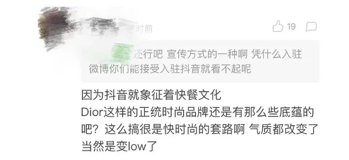 “抖音象征快餐文化,DIOR这样的正统时尚品牌还是有底蕴的,太违和”、“抖音用户买得起DIOR?我错看抖音了”……潮水般的嘲讽背后,其实是对奢侈品“附加值”的质疑。