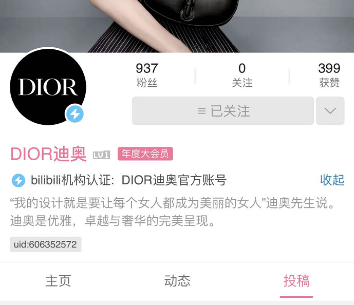 不过值得肯定的是,DIOR注册B站账号的行动,也算是为其他高奢品牌做出了表率。相信很快诸如Chanel、Prada、LV等品牌将纷纷入驻B站,加入UP主行列。