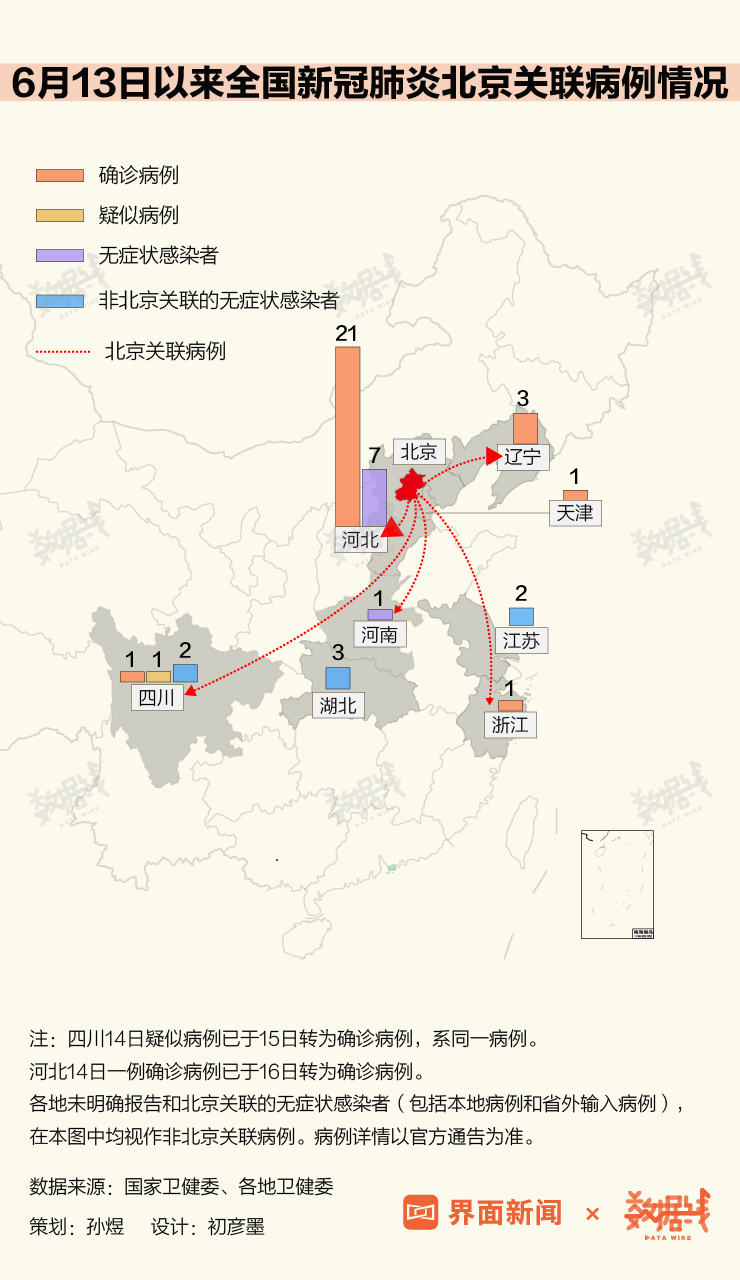 截至6月27日,全国范围内,辽宁、河北、浙江和四川已累计报告关联北京确诊病例共计27例。其中,河北21例。