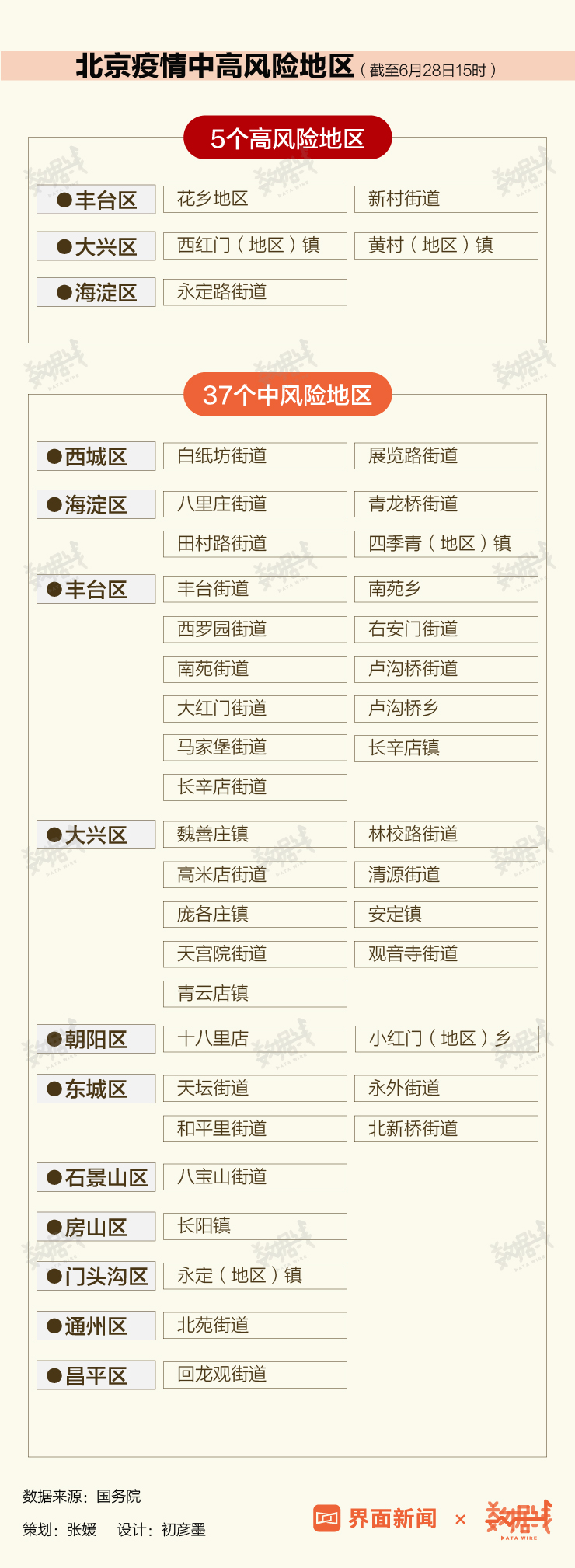 截至6月28日15时,北京目前尚有5个高风险地区,37个中风险地区。