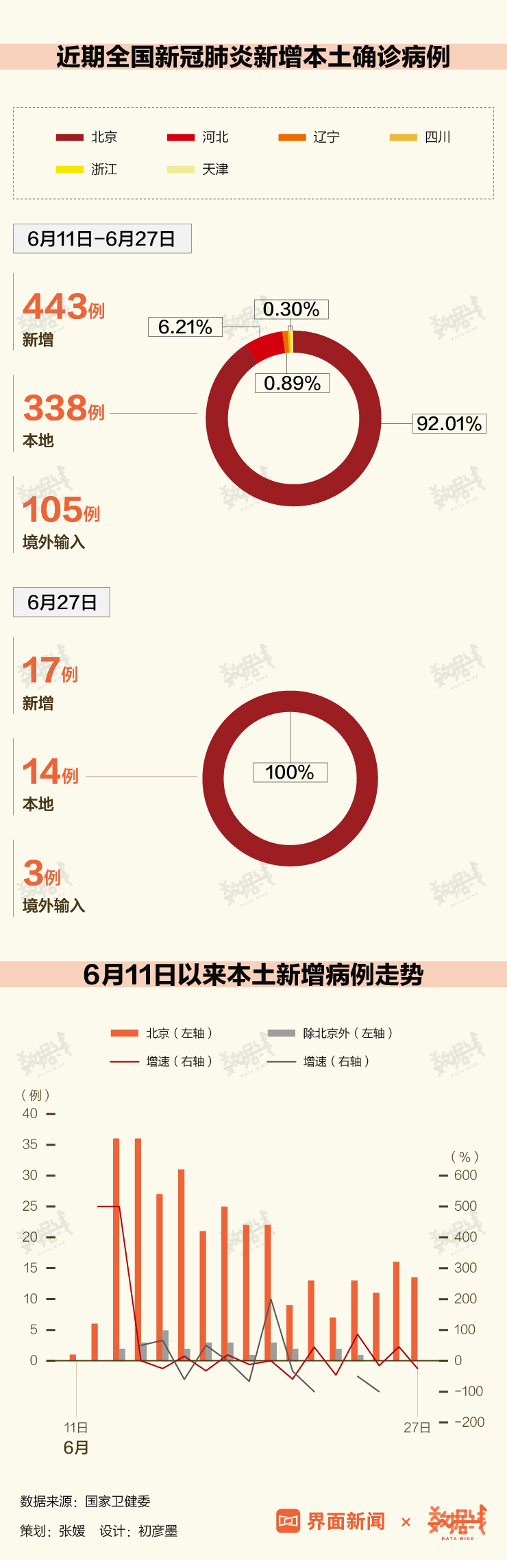 从6月27日单日数据来看,当日全国报告新增本土病例14例,均在北京。除北京外,全国已连续3天无新增本地确诊病例。