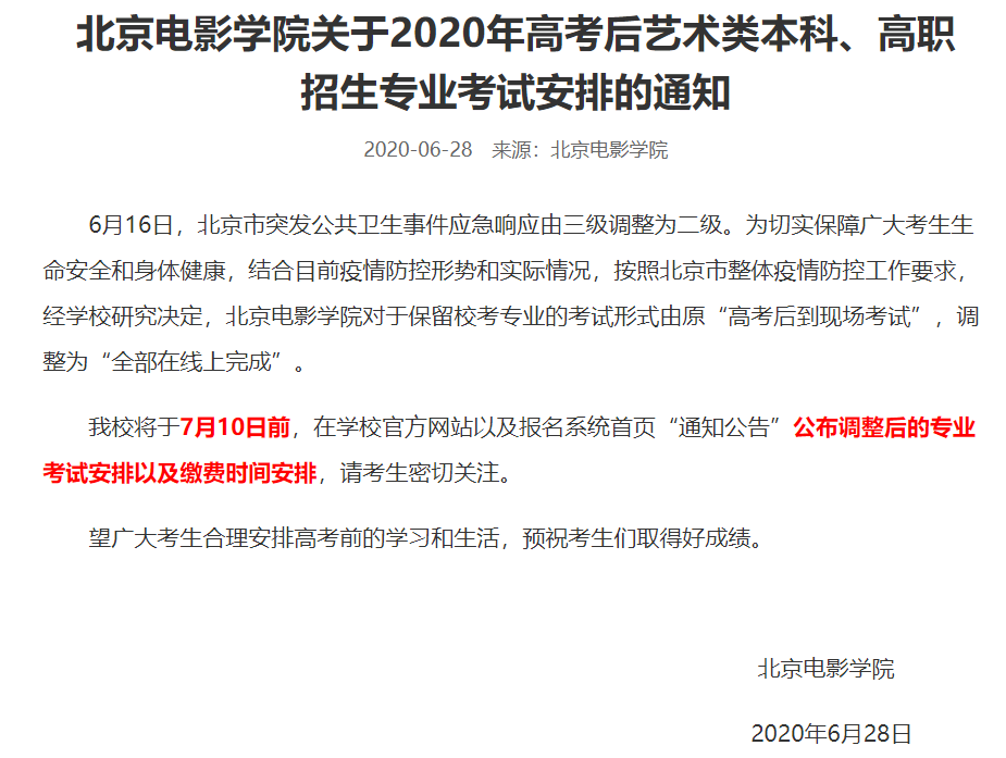 北京电影学院官网6月28日消息,6月16日,北京市突发公共卫生事件应急响应由三级调整为二级。为切实保障广大考生生命安全和身体健康,结合目前疫情防控形势和实际情况,按照北京市整体疫情防控工作要求,经学校研究决定,北京电影学院对于保留校考专业的考试形式由原“高考后到现场考试”,调整为“全部在线上完成”。