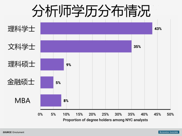 调查发现,在华尔街分析师当中拥有理科学士学位的人最多,占全部调查人数的43%,文科学士以35%的比例位列第二。