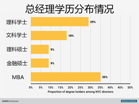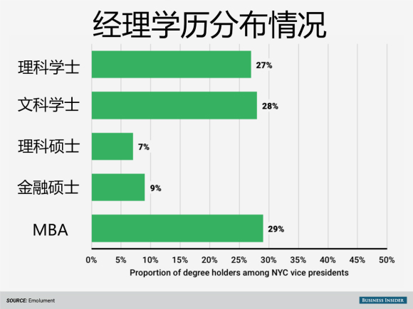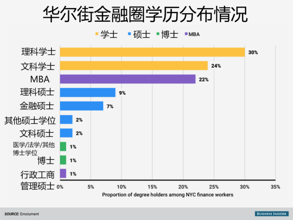 据Business Insider报道,美国薪酬基准分析网站Emolument收集了840个在纽约工作的金融界人士的资料,发现尽管MBA仍然是投行高管们通常具备的学历,但数量并非有压倒性优势。从整体数量上看,拥有理科学士学位的人在华尔街最吃香。