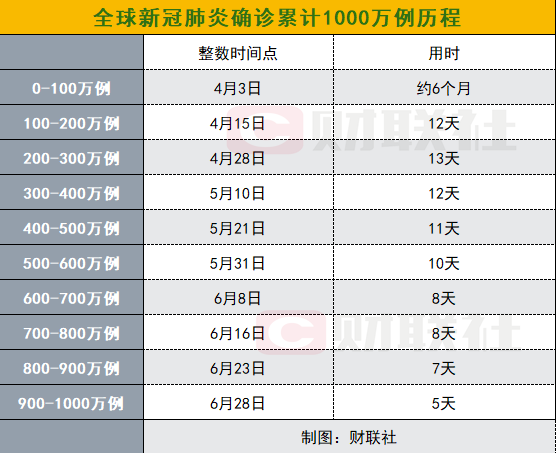 美国约翰斯·霍普金斯大学发布的实时统计数据显示,截至北京时间6月28日17:47,全球累计确诊新冠肺炎超1000万例,为10001527例,从百万到千万仅86天,累计死亡499024例,累计确诊国家和地区数188个。其中,美国累计确诊2510323例,累计死亡125539例。