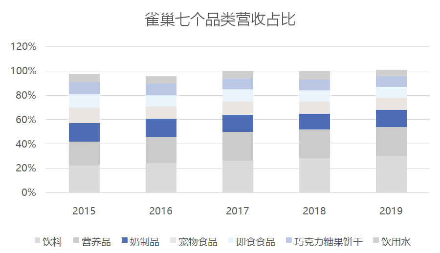 发力高附加值产品的思路与国际企业的策略接轨。近几年雀巢七大业务门类中有两大板块营收占比显著提升,其一是营养健康品,其二是宠物护理产品。而这两类产品均具有较高的附加值,营养健康品的毛利率最高,达 21.15%;宠物护理产品达18.25%且处于上升通道。