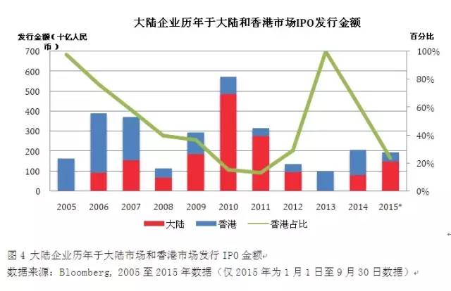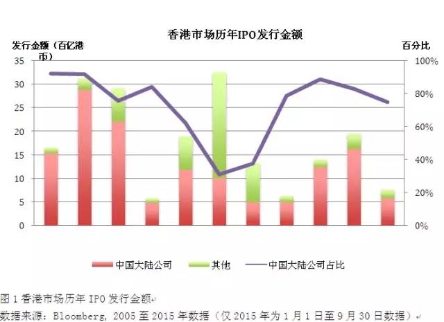 我们对2005年至2015年大陆企业在大陆和香港市场发行IPO的数目和金额进行统计和对比,仅考虑普通股股票。大陆企业在香港的IPO数目通常占到其在香港和大陆市场IPO总和的10%-30%左右。
