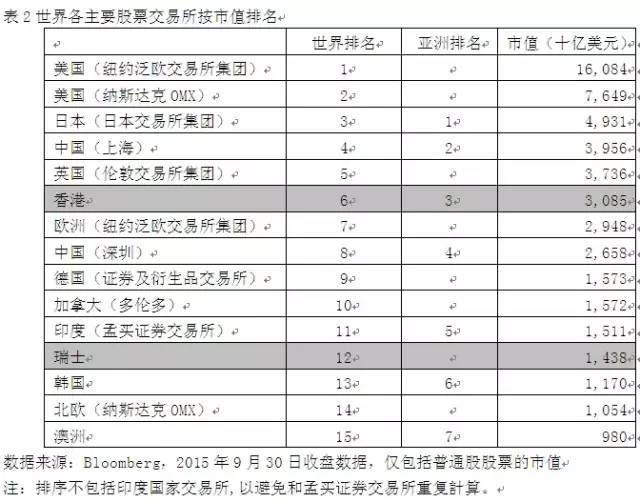 为证明这一点,我们取世界各主要股票交易所于2015年9月30日收盘的市值进行比较,仍然仅考虑普通股股票的市值,其排名如下表2所示。在全世界范围内,香港交易所以30,850亿美元的市值排在美国纽约交易所、纳斯达克交易所、日本交易所集团和中国上海交易所之后列第五,而在亚洲范围内排在第三。