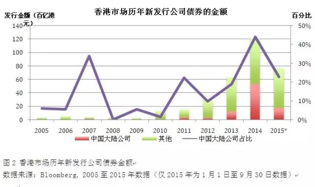 自金融危机后香港市场历年发行公司债券的数目大幅增加。中国大陆企业的占比虽然有较大波动,但整体呈增加的趋势。从2008年到2014年,中国大陆企业发行债券数目占香港市场的比重从不足10%增加至30%以上。
