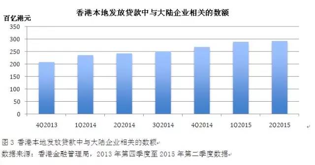 除了股权融资和债权融资,银行贷款(包含贸易融资)是国内企业从香港市场融资的另一途径。我们统计过去近两年内每个季度香港本地银行及其在大陆开设的分行对大陆企业发放的贷款,但不包括香港本地银行注册在内地的子公司所发放的贷款,其趋势如下图3所示。可以看到,自2013年底以来香港本地银行向大陆企业发放的贷款一直呈稳步增加的趋势。