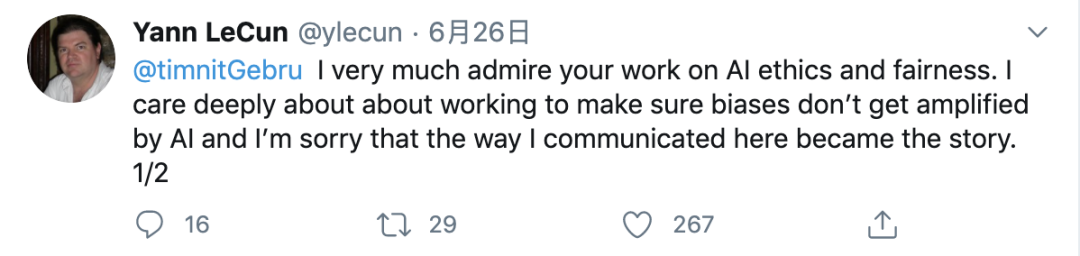 向来以直言不讳的Yann LeCun在连发数十条推特后,最终做出了道歉声明:“很抱歉我在Twitter对此事的评论成了话题中心。”