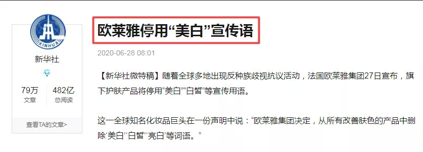 然而,随着全球反种族歧视运动的愈演愈烈,一时间,“白”和“黑”都成了敏感词,相关产品纷纷下架、停产、删除相关词语,外资美妆品牌成为众矢之的,其在中国的美白生意无疑也将受到影响。