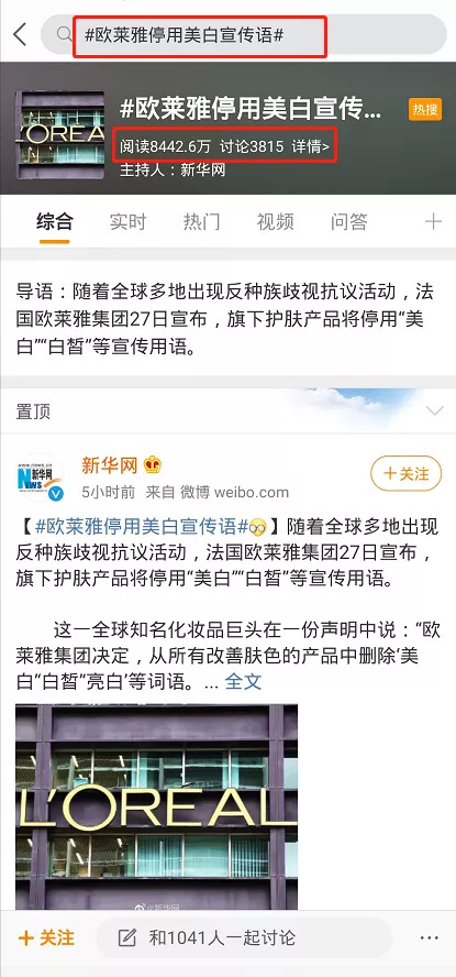 今天,欧莱雅停用美白宣传语的声明快速发酵,并登上微博热搜。截至发稿,#欧莱雅停用美白宣传语#的话题在新浪微博已有8442.6万的阅读量。