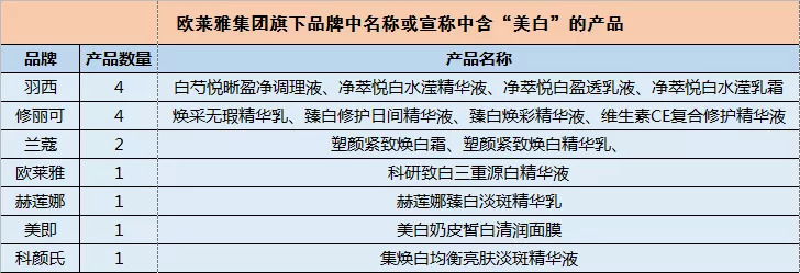 欧莱雅集团旗下品牌中名称或宣称中含“美白”的产品(数据来源于各品牌天猫旗舰店)
