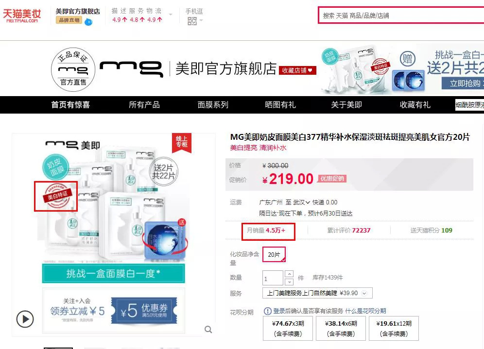 青眼在各大平台了解到,上述产品目前仍在正常销售,名称和宣称也均并未变化。并且,其中部分美白产品销量可观,譬如,美即天猫旗舰店中一款美白奶皮皙白清润面膜月销量已突破4.5万件,欧莱雅天猫旗舰店中的一款科研致白三重源白精华液月销量也超过了2万件。