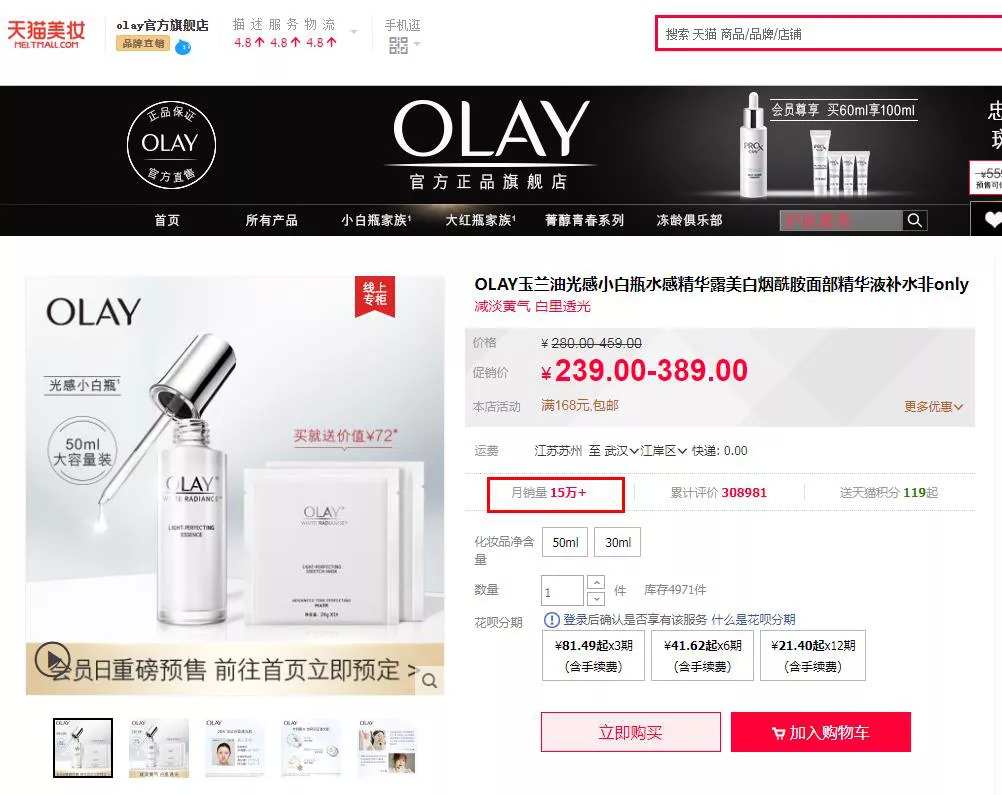 也正因如此,外资美妆品牌纷纷在亚洲市场不断加码布局美白产品,中国更成为重中之重。典型如宝洁旗下OLAY,正是凭着一款含有烟酰胺成分、具有美白功效的水感透白光塑精华露(俗称小白瓶)在中国市场上打了一个漂亮的“翻身仗”,目前该产品在天猫旗舰店的销售已突破了15万件。