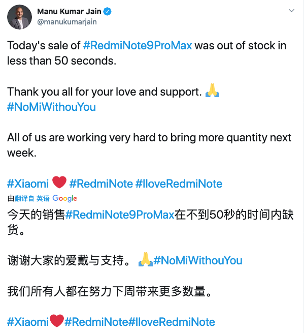 在6月24日的一条推文中,Jain说道,小米的红米Note9 Pro Max在销售过程中不到50秒就断货了。他表示,反华情绪主要限于社交媒体,并没有影响到其在印度的业务。