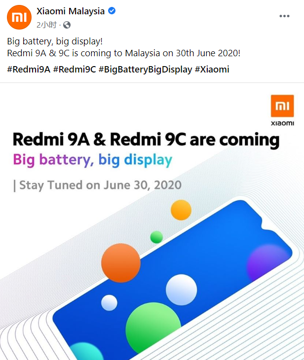 6月29日,小米马来西亚通过Facebook宣布,Redmi 9A与Redmi 9C将于6月30日在马来西亚发布。海报显示,这两款手机将采用大电池和大屏幕。Redmi 9A(型号为 M2006C3LG)此前已通过FCC、泰国NBTC认证。