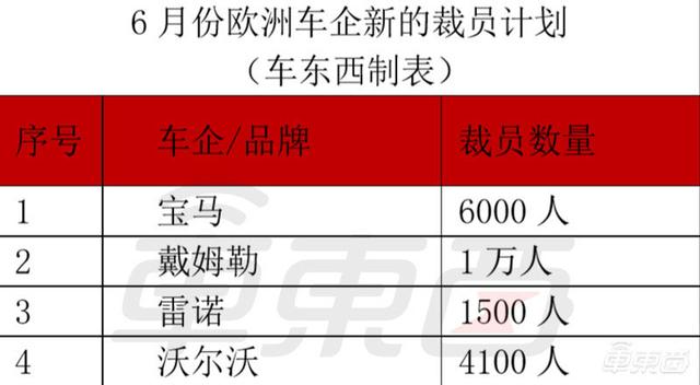 另外,根据最新消息,6月10日之后,欧洲的宝马、戴姆勒、雷诺以及沃尔沃又发布了新一轮裁员的裁员计划。