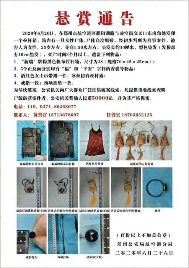 6月26日,郑州市公安局航空港分局发布一则悬赏通告,20日在郑州航空港区郑州市航空港区鄱阳湖路与凌空街交叉口东南角处发现一个拉杆箱,箱内有一具女性尸体,尸体高度腐败,经初步判断为刑事案件。