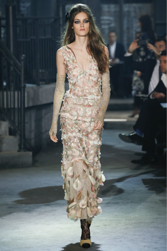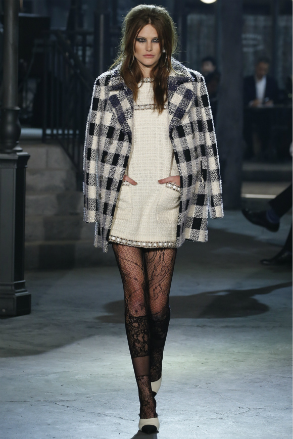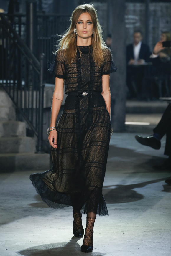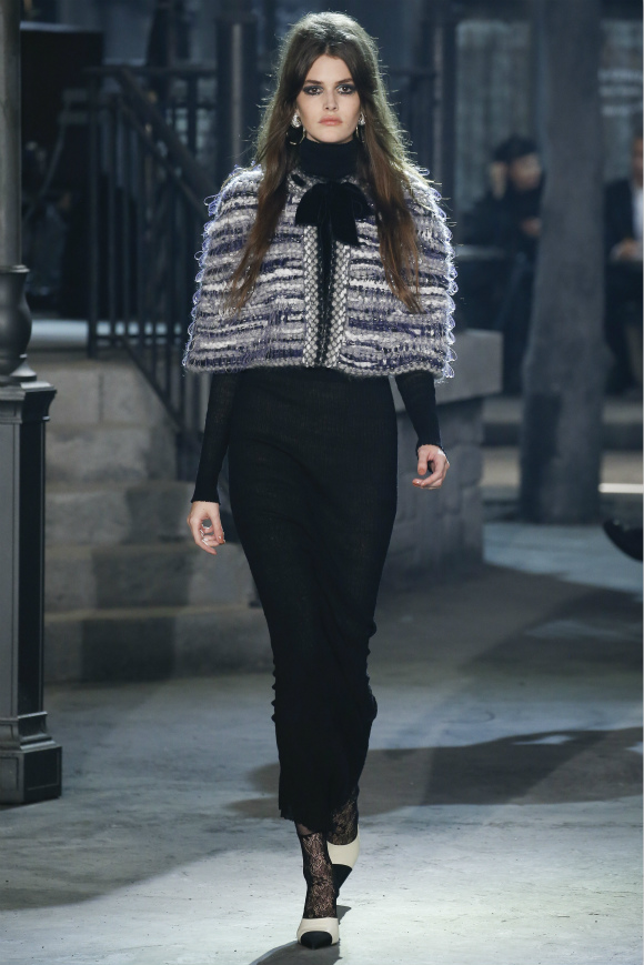 开场模特是Lara Stone,紧接着鱼贯而出的超模包括Freja Beha、Jamie Bochert、Bella Hadid、Molly Bair、Sam Rollinson和Lindsey Wixson。身为高级手工坊系列,褶裥、流苏、贴花、刺绣等耗时工艺在裙装、夹克和斗篷上随处可见。Chanel极具标志性的皮革和斜纹软呢同样出现在长裤、裙装和外衣中。