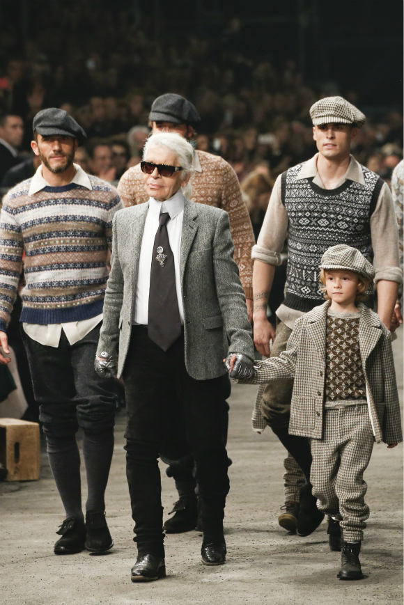 电影城中的5号摄影棚(多有象征意义的No.5!)被彻头彻尾地改装成巴黎街区——小酒馆、面包店、地铁站、意大利餐厅,甚至还有Karl最常光顾的电影院Le Paris。在酒馆露天餐桌边坐着头排嘉宾Rooney Mara和Kristen Stewart,老佛爷的缪斯Kroening一家则打扮成卖报童,在现场分发《Chanel日报》。