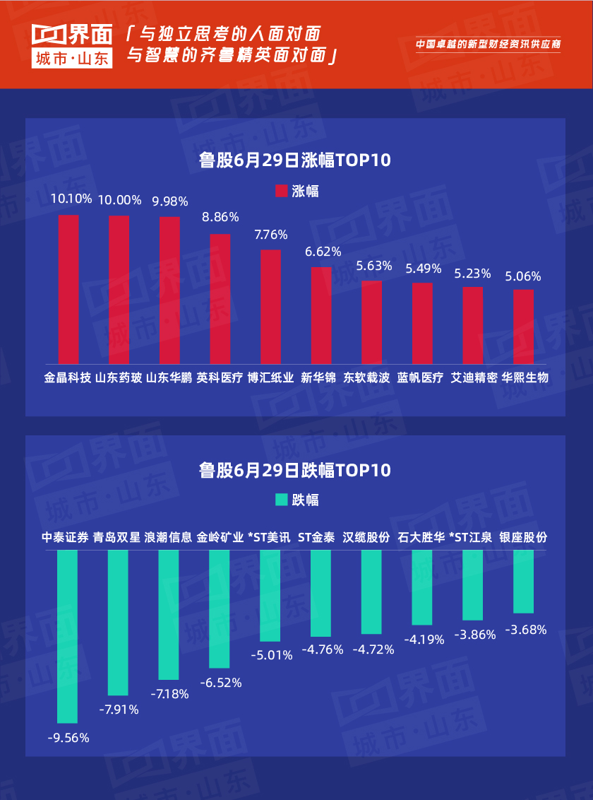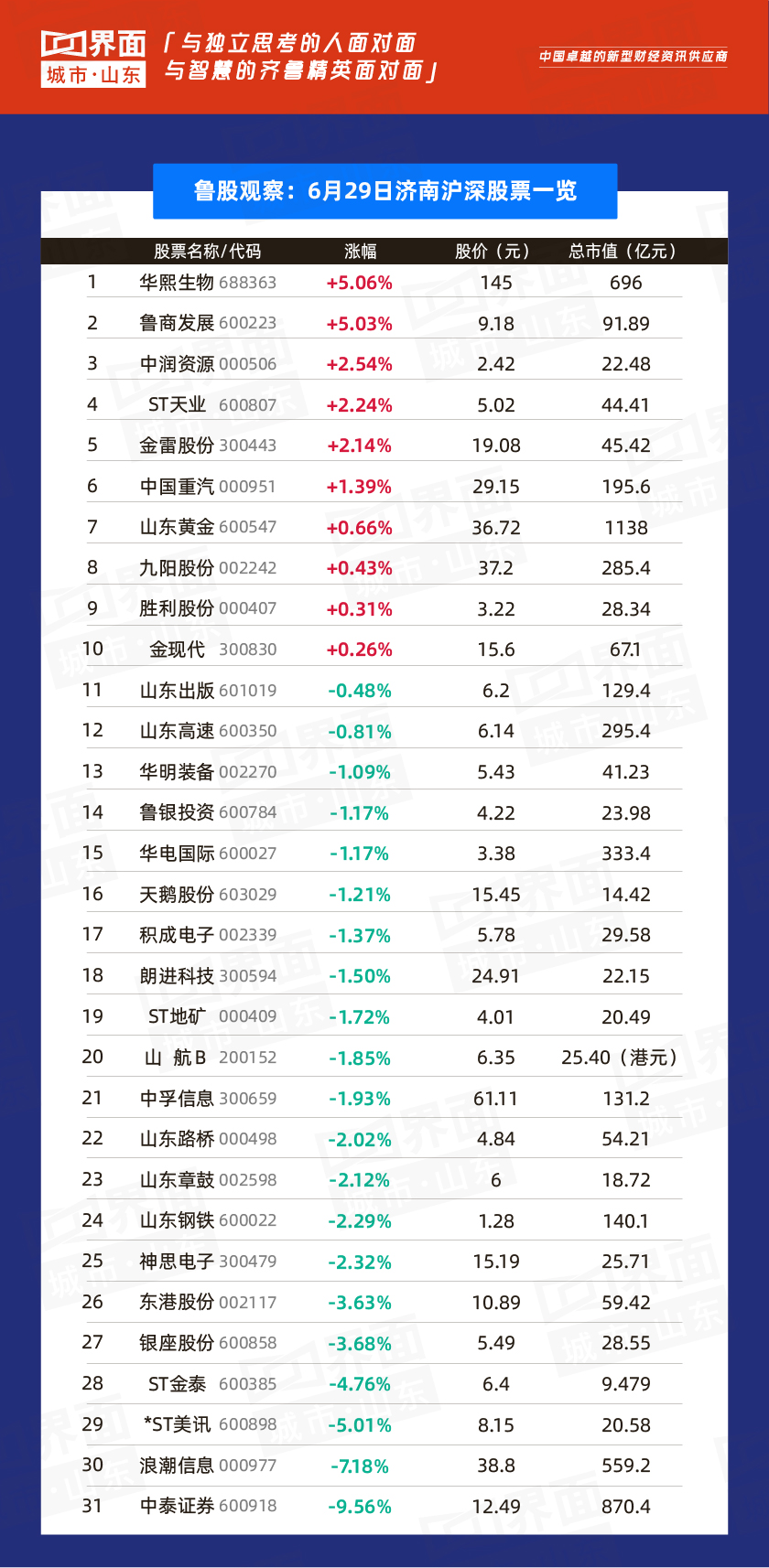 6月29日,山东省内沪深股票有76只个股上涨,128只下跌,7只与上一个交易日收盘价持平;总市值过千亿的有万华化学(600309)、山东黄金(600547)、潍柴动力(000338)、海尔智家(600690)共4家,500亿-1000亿的共有5家,分别是青岛啤酒(600600)、浪潮信息(000977)、歌尔股份(002241)、华熙生物(688363)、中泰证券(600918)
