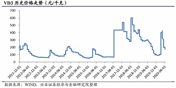 近年来,维生素D3价格呈周期性波动。2018年年中,该价格迅速冲高后便持续性下跌。