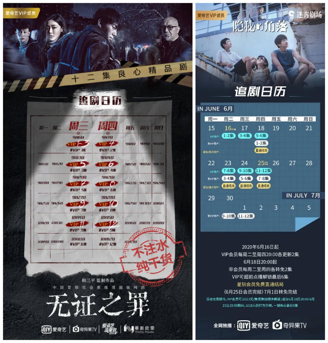 除了档期强弱、推广力度、演员知名度以及观众成熟度的不同,还有一个重要因素,便是排播方式。2017年的《无证》采用每周两集、会员抢先看一周的节奏播出,即便是会员也要追足一个月。