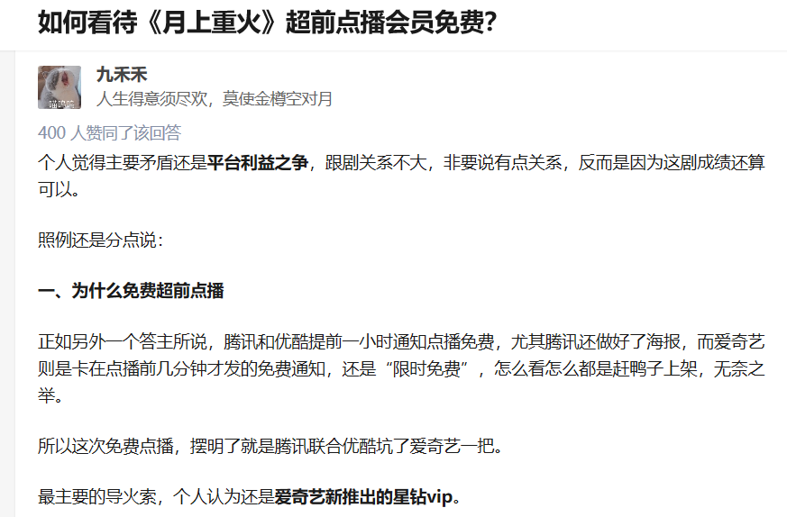 一部剧三家播,观众可能会为了图省事或者已有星钻会员而更倾向于在爱奇艺观看。不久前《月上重火》的大结局免费点播事件,便有网友猜测,是由星钻会员引发的平台利益之争。
