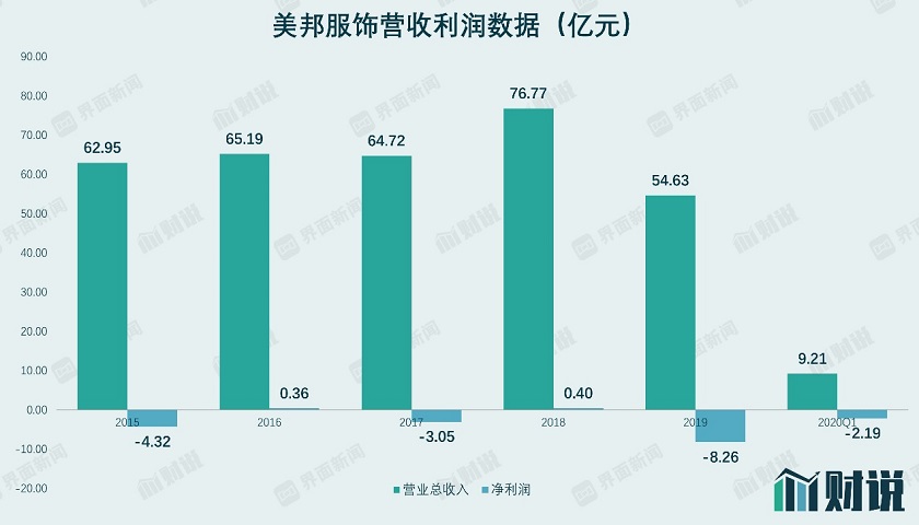 2019年,美邦服饰整合资源,关闭低效门店。这也导致其当年营业收入大幅下滑28.8%至54.63亿元,亏损额更是高达8.26亿元,创造了上市以来最大亏损记录。