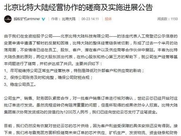同样在6月23日,吴忌寒控制下的微信公众号“蚂蚁矿机ANTMINER”发布了关于北京比特大陆经营协作的磋商及实施进展公告,表示本着为比特大陆负责的原则,两位大股东派出代表,在热心股东和热心第三方的帮助下,就公司生产经营等基本问题进行了磋商,并初步达成了共识。主要共识包括:第一,尽可能维持公司正常生产经营秩序,特别是降低对外部客户和供应商的影响;第二,保持公司账务及时和完整,确保公司财税合规;第三,稳定公司员工。