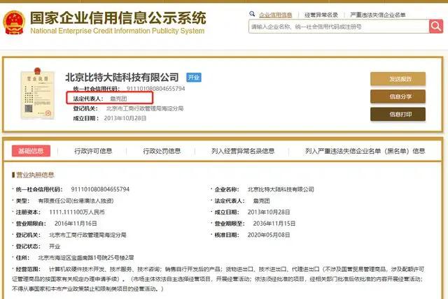 虽然詹克团营业执照被抢走,但在国家企业信用信息公示系统中,詹克团已是北京比特大陆法定代表人。