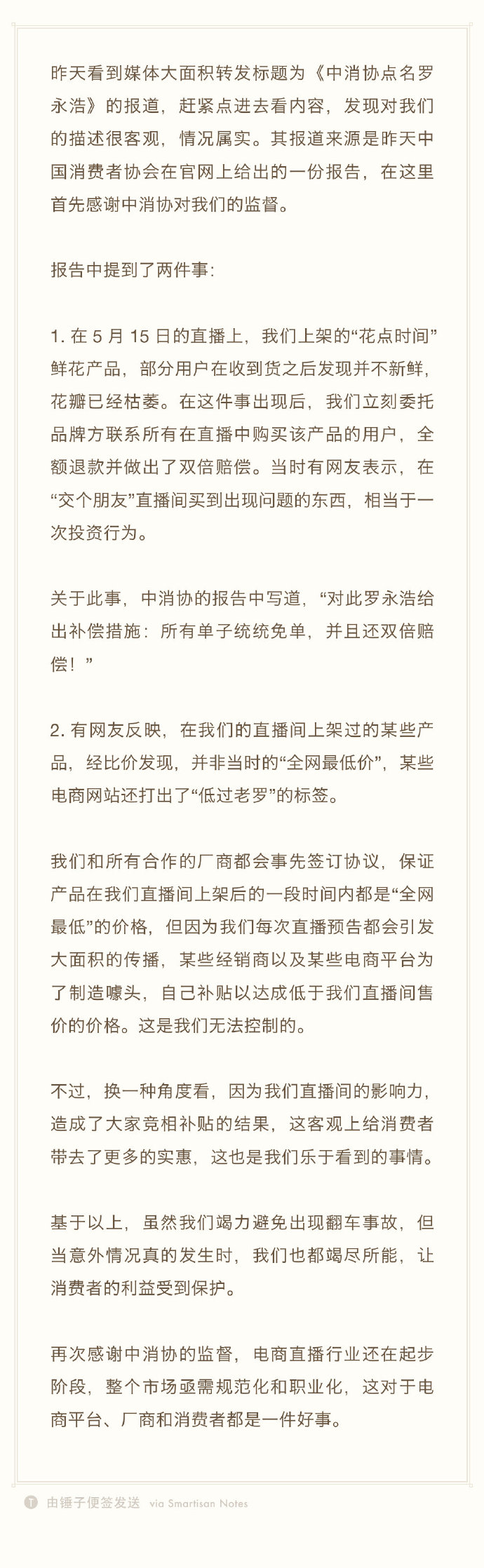 6月30日,罗永浩在个人微博转发关于“媒体大面积转发标题为《中消协点名罗永浩》的报道”的事实情况声明。罗永浩称,看到媒体大面积转发《中消协点名罗永浩》的报道,赶紧看了内容发现对我们的描述很客观。罗永浩表示,感谢中消协的监督,电商直播行业还在起步阶段,整个市场亟需规范化和职业化,这对电商平台、厂商和消费者都是一件好事。