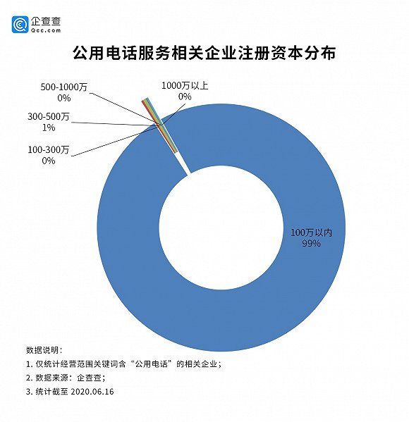 企查查显示,从公用电话服务领域相关企业注册资本来看,绝大多数企业的注册资本在100万以内,占所有相关企业数量的99%。