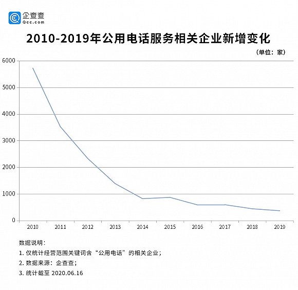 企查查截取了2010-2019年公用电话服务领域相关企业新注册变化数据,发现自2010年后,公用电话产业便出现颓势。十年来一直呈现断崖式下跌,平均每年的企业新增注册量下降22%。