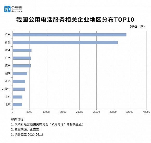 按地区分布来看,企查查数据显示,广东、新疆两地以绝对多的公用电话服务相关企业数量占据了第一、第二名,其中广东省内共有3.3万家公用电话企业,占全国所有公用电话企业数量的27.26%。