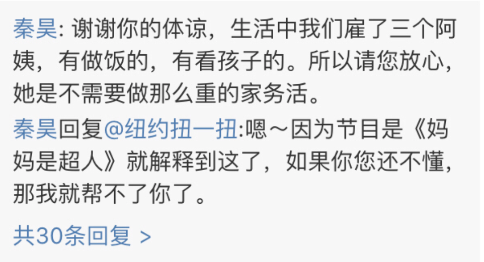 逼的秦昊只能自己上了微博解释,这种综艺中突发的灰姑娘人格,“家里有三个阿姨,她不用做那么重的家务活”。