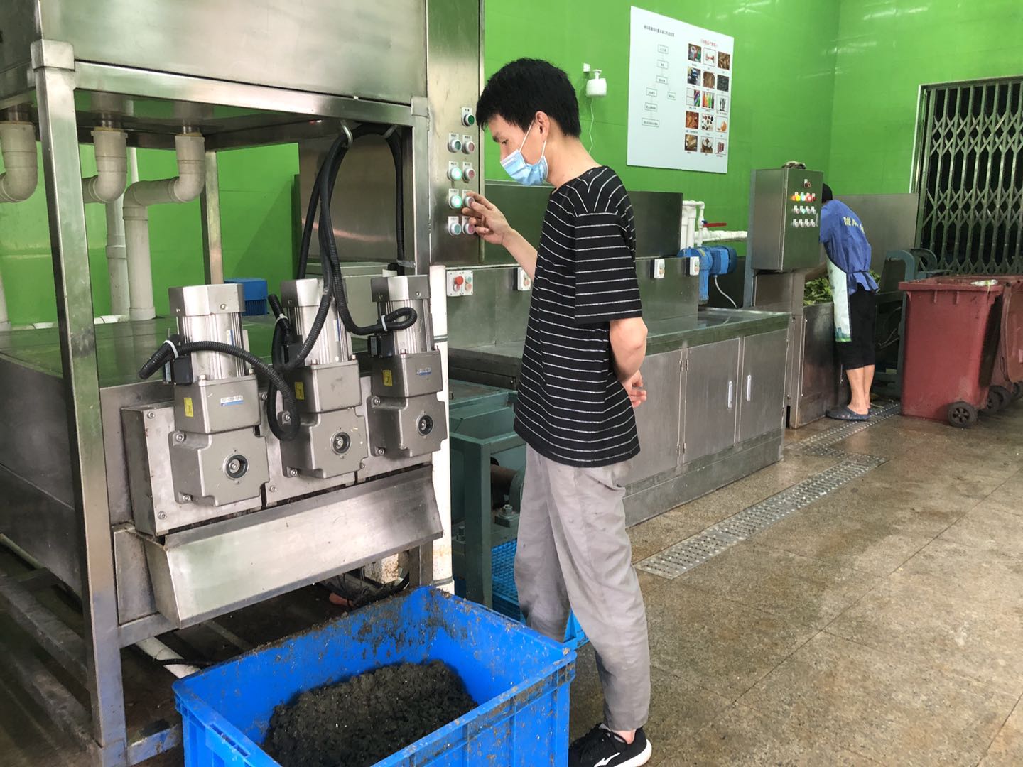 以往,刚收集来的湿垃圾堆积在湿垃圾桶里,一打开盖子就有一股臭味。粉碎固液分离一体机处理后,湿垃圾经过脱水、研磨压缩成了墨绿色的“干”垃圾,体积小了、份量轻了,湿垃圾也减少了异味,清运起来更加方便。“原本一天40多桶湿垃圾,经过处理后,可以被压缩为7、8桶湿垃圾,大大减少了垃圾的数量。”周鉴华说道。