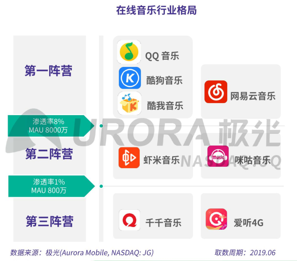 根据艾瑞咨询数据,截止到2020年1月,国内音乐平台市场仍呈现出“一超一强”的局面。酷狗音乐、QQ音乐、酷我音乐分别以3.2亿、3.1亿、1.9亿的月独立设备数位列前三,紧随其后的网易云月独立设备数为1.65亿。