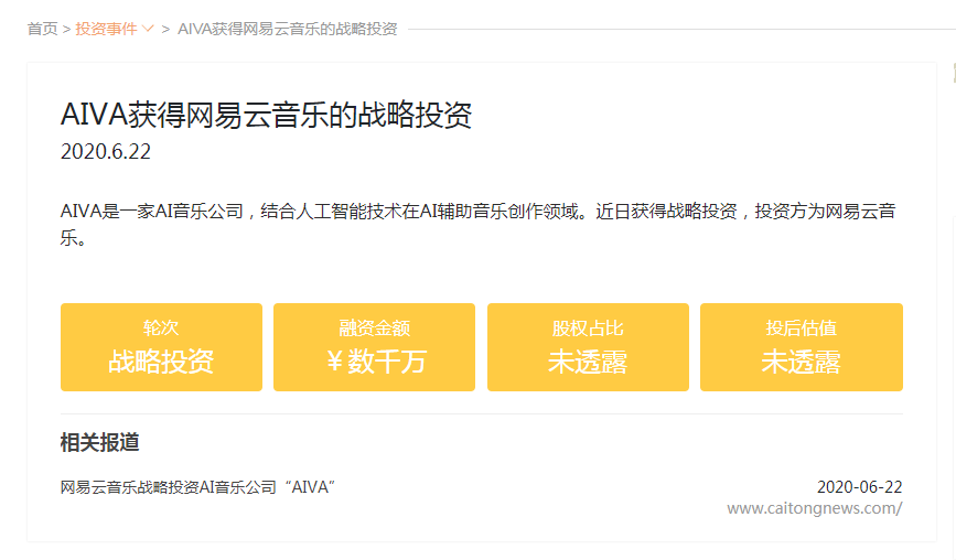 从外媒的报道来看,AIVA最近的一轮融资是在2017年,当时筹集到了73万美元的资金。网易云去年12月份就已开始与他们接触,最初是探讨共同开发一款新品。此次战略合作,AIVA获得了来自网易云数千万的投资,网易将帮助他们扩充研发团队,专注于国际业务的增长,AIVA也会与网易在中国市场进行合作。