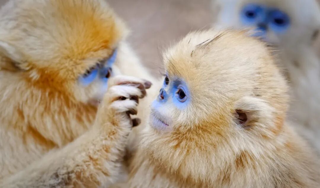 我国有3种金丝猴,川金丝猴、滇金丝猴、黔金丝猴。生活在秦岭地区的川金丝猴,毛发金黄,嘴巴和眼睛四周有天蓝色的毛发,仰天向上的朝天鼻是它们有趣的特征。